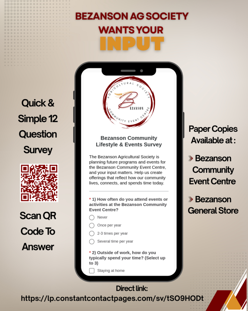 The Bezanson Agricultural Society is planning future programs and events for the Bezanson Community Event Centre, and your input matters!